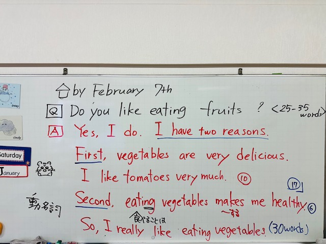 この14年の間に、英検®は英作文力を求められるようになり、英作文も2題になるなど、書く力を求められています。また自分の力で書けるようになり、それを瞬時に答える力を要するのが二次試験の面接力と直結するため、この英作文は楽しく楽しく!どんどん書けるように!と、指導しています。