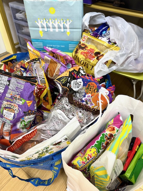 ハロウィンでは毎年たくさんのお菓子の寄付を保護者の皆様からいただき、マイティ生全生徒(小学生から高校生まで)に渡しています。