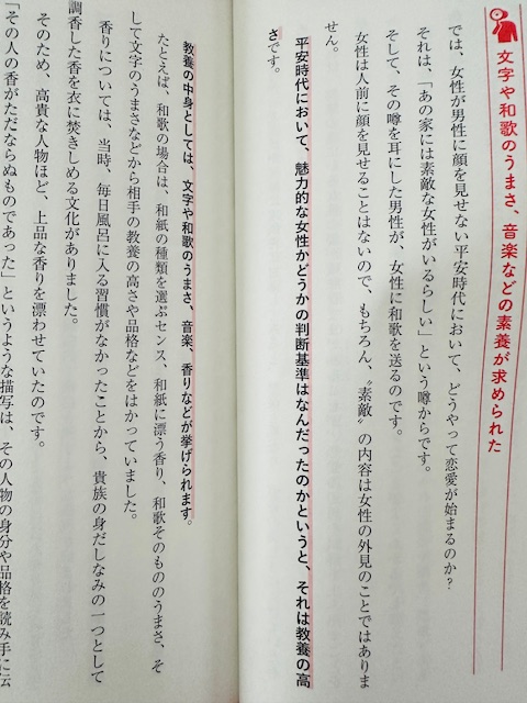 平安時代の教養とは文字や和歌のうまさ、音楽、香りなど芸術面、目にみえにくい感性、現代の言葉でいうと、よく見聴きする非認知能力という言葉に当てはまるのではと思いました。可視化されない分、判断、判定の基準値もない分、指導する側は大変ですが、日常生活から得る何らかの経験や本人の考え方から構築されていく後天的なものという観点からは、誰もが習得可能な教養であることに、教育の面白さや可能性を感じます。