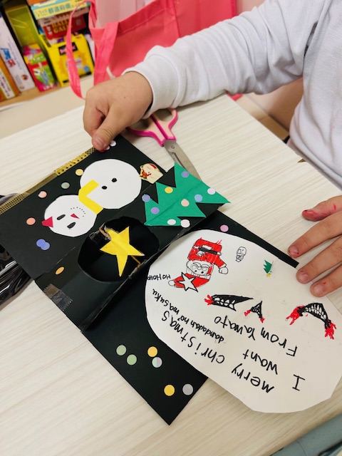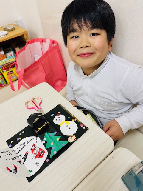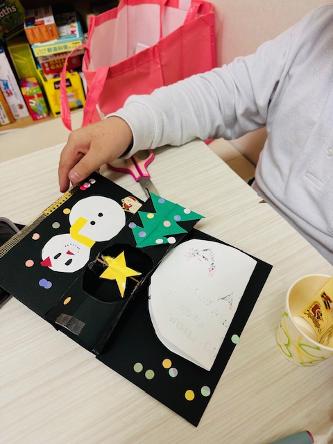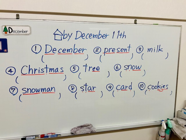 単語の練習、欲しいものを言うには?、書く言葉の練習、クリスマスに関係する英単語に触れながら、また工作から得る簡単な英単語のやり取りを学びました。