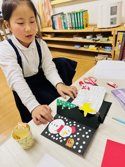 切ること、糊で貼ること、シールを使うことなど、作業をしながらだと英語もスムーズに入ってくるようです。
