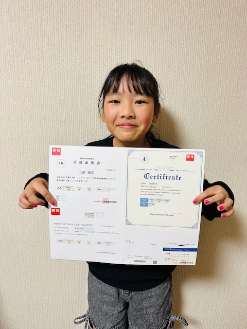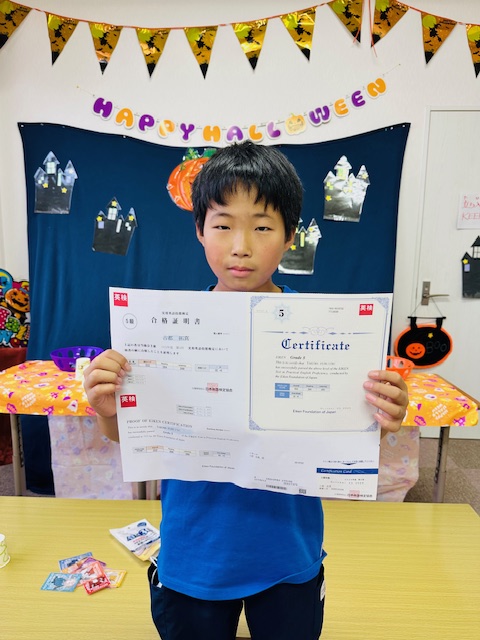 1人で受験、一人合格。土曜日14時半クラスメンバーの男の子。レッスンでは全員で英検®4級・5級問題を解いて練習していましたが、こちらの拓真君は5級内容の練習は文句なしでしたので、これで証明が出来て良かったです。