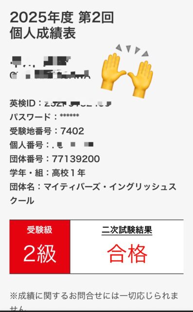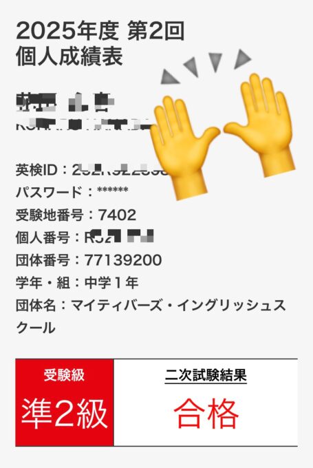 一次試験の結果が既に準2級プラス合格レベルでしたので、よほどの失敗をさせない限り、この試験は合格できると確信していました。そのため、よく練習している本人にずっと「そのままで大丈夫!思い切って行っておいで!」と背中を押していました。